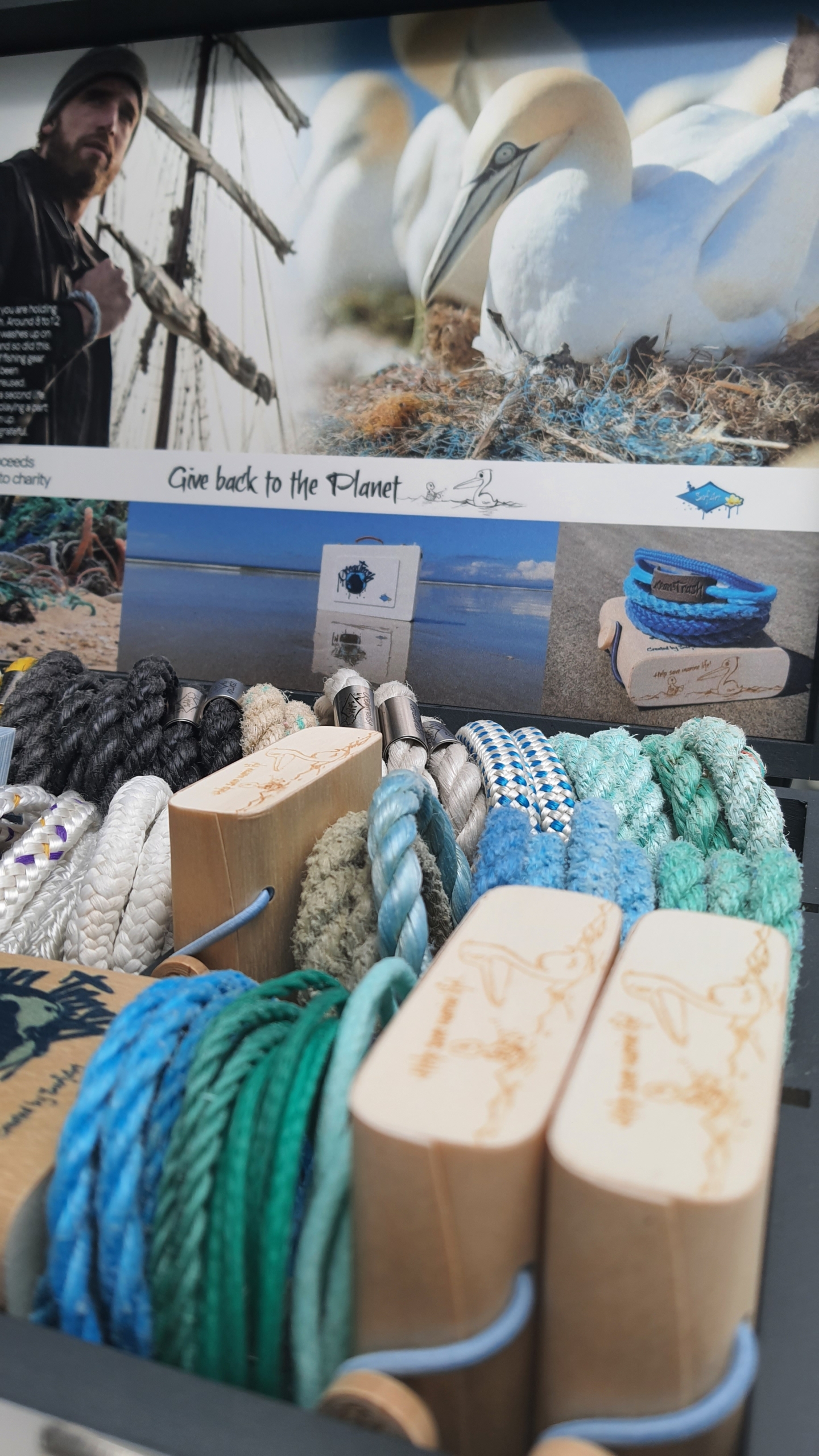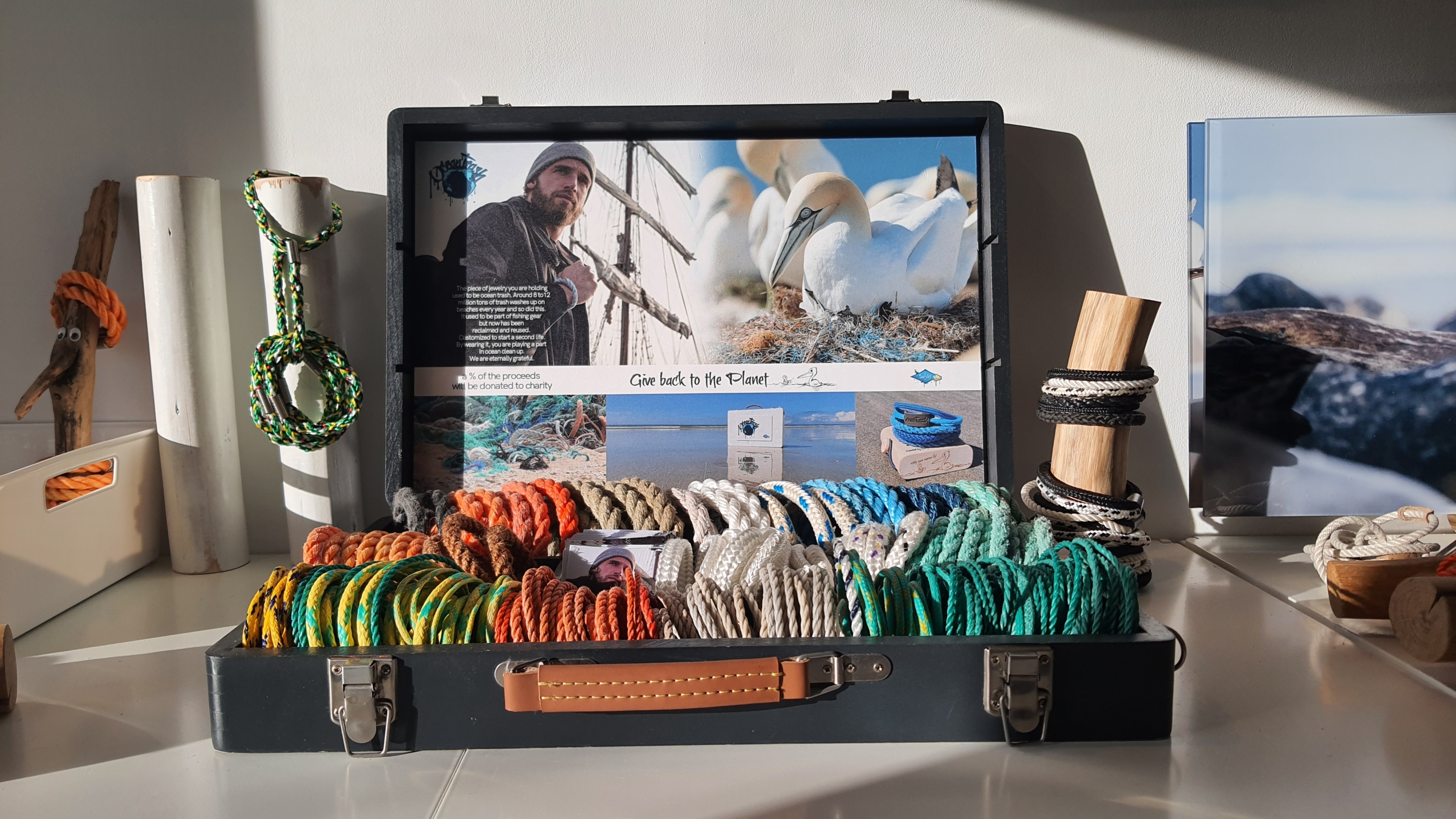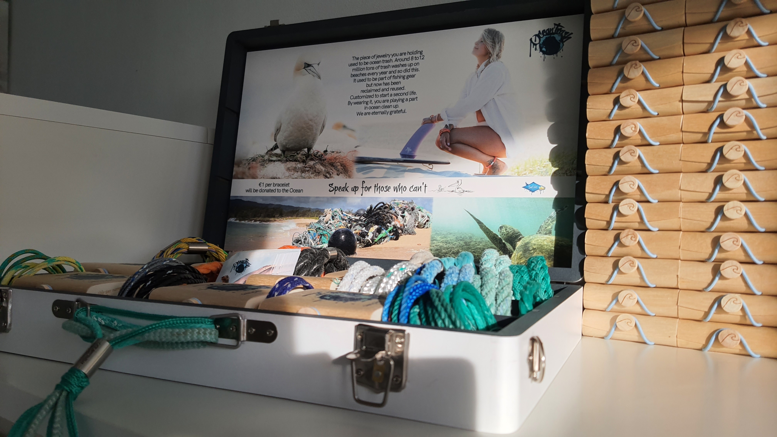 The products come with a great display case. It’s a must-use so please use this great marketing tool to your advantage. It tells the story of OceanTrash plus it is great for taking the products on the road when needed. Feel free to combine it with your own creations.